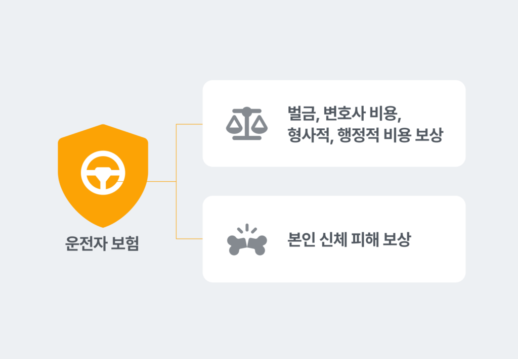 - 운전자 보험: 자동차 보험에서는 보장하지 않는 벌금, 교통사고 합의금, 변호사 비용 등 형사적/행정적 비용을 보장해 주는 상품으로 선택적으로 가입할 수 있어요.