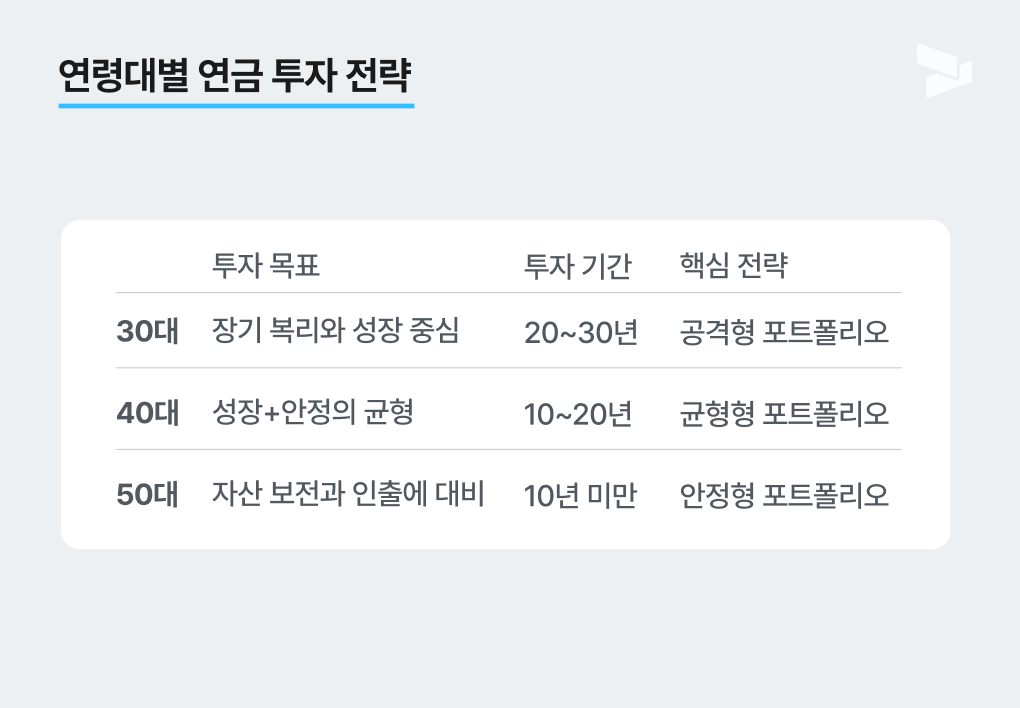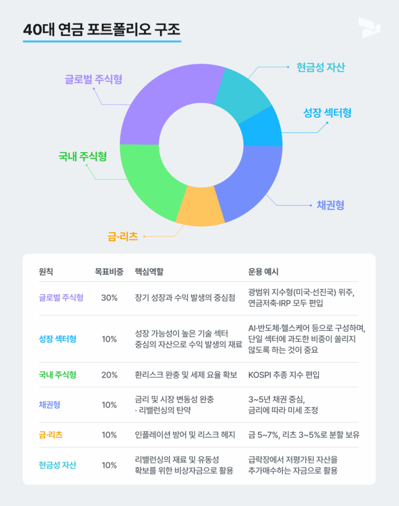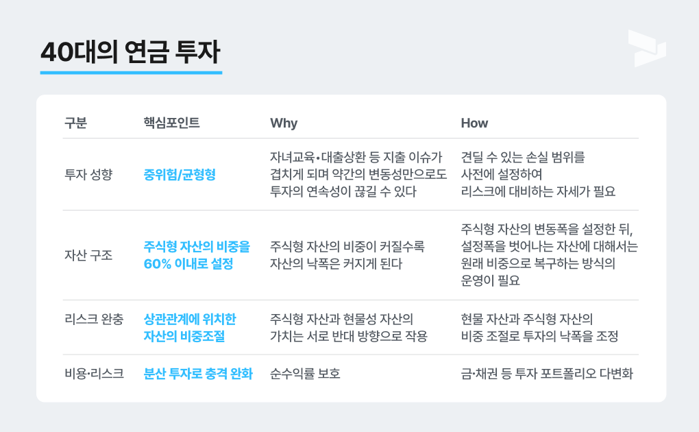 40대는 소득이 오르는 동시에 자녀 교육•주택 구매•부채 상환 등 지출이 가중되는 시기로 연금 투자에서는 30대와 같은 과감한 투자보다는 하락장에서 버틸 수 있는 안정적인 자산 구조를 만드는 것이 핵심입니다.