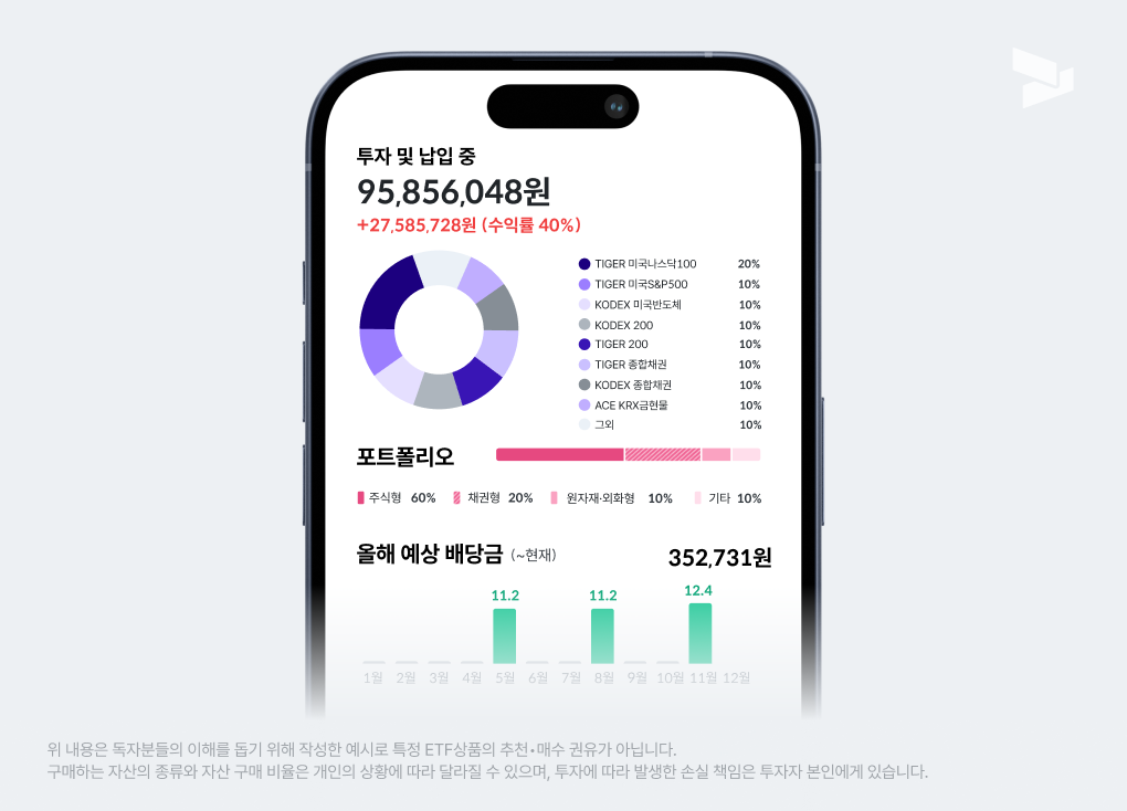 균형형 포트폴리오 구조에 맞춘 실제 투자는 아래와 같이 진행할 수 있고, 시그널플래너 앱을 통해서 자신이 보유하고 있는 투자 자산의 비율과 예상되는 배당금을 확인할 수 있습니다.