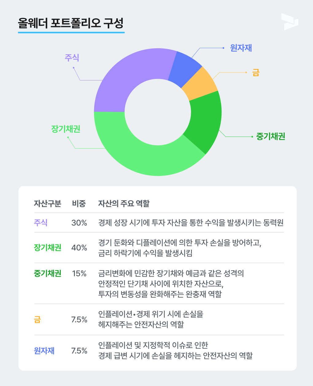 올웨더라는 명칭 그대로, 경제 성장•경제 둔화•경기침체 등 경제의 봄•여름•가을•겨울 모든 국면을 모두 버틸 수 있도록 설계된 포트폴리오입니다.