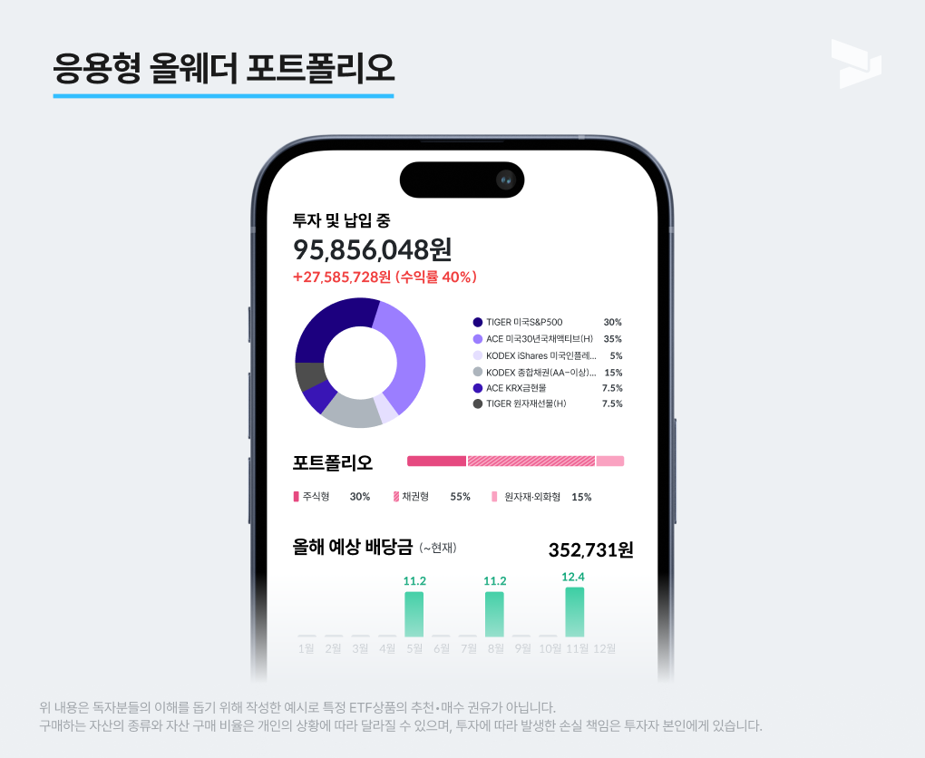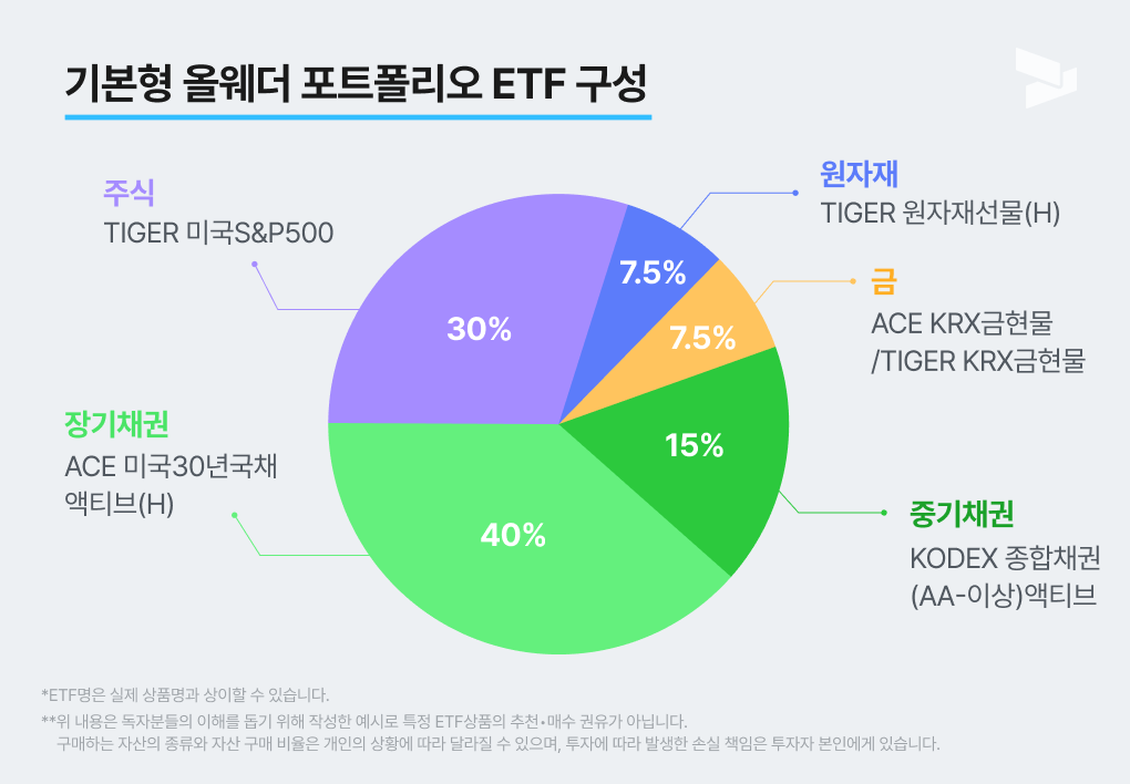 (독자분들의 이해를 돕기 위해 작성한 예시로 특정 ETF상품의 추천•매수 권유가 아닙니다. 구매하는 자산의 종류와 자산 구매 비율은 개인의 상황에 따라 달라질 수 있으며, 투자에 따라 발생한 손실 책임은 투자자 본인에게 있습니다.)