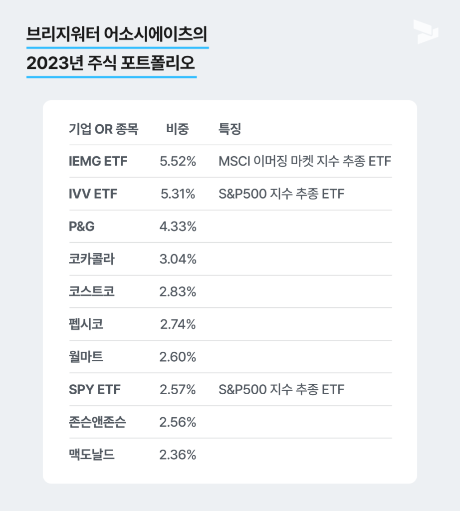 2023년 브리지워트 어소시에이츠의 투자 포트폴리오의 상위 10개 종목 리스트입니다.