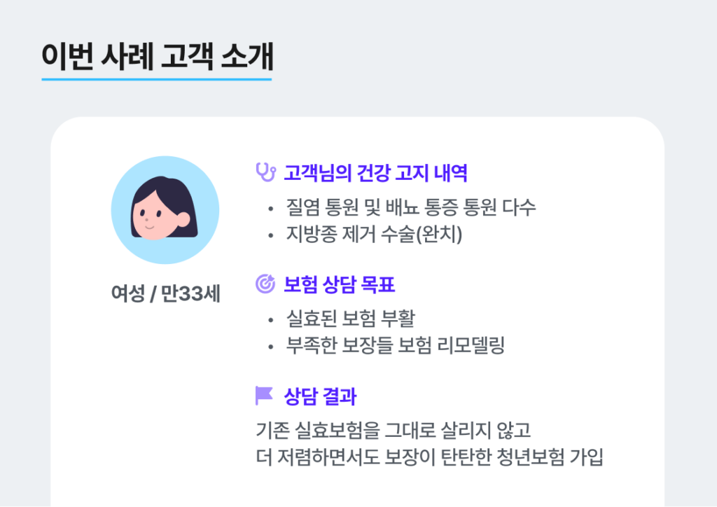 - 맞춤형 상품 매칭: 민지님의 경우 만33세 여성에게 유리한 조건을 제시하는 N보험사와 K보험사의 보험을 조합하여 최적의 포트폴리오를 구성했습니다. 각 보험사의 강점을 살린 설계로 보험료 효율성을 극대화했습니다.