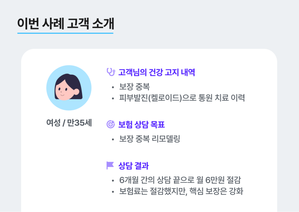 - 피부 켈로이드 치료력으로 인한 피부발진 관련 전기간 부담보 이슈가 있었지만, 6개월간의 상담 끝에 월 6만원을 절감하며 핵심 보장을 강화