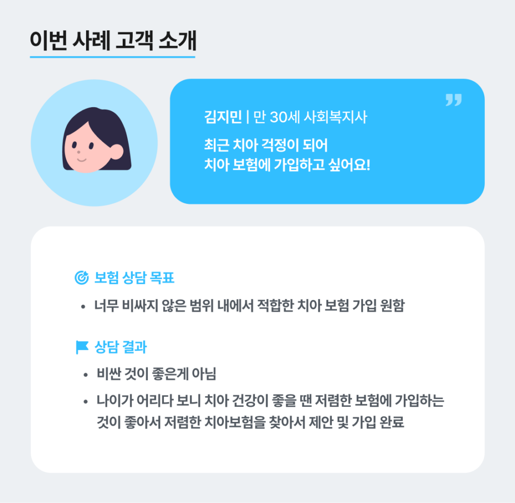 - 해결책: 30대에게 가장 빈번한 충치(씌우기) 보장은 챙기되, 보험료는 2만 원대로 낮춘 실속형 맞춤 설계